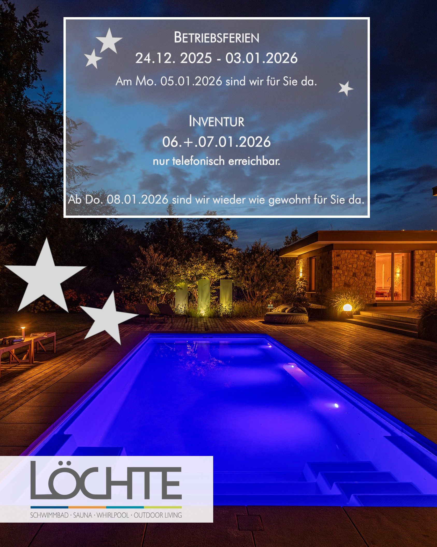 Die Löchte GmbH verfügt über mehr als 30 Jahre Erfahrung in der Planung, dem Bau und der individuellen Gestaltung exklusiver Pools, Saunen und Whirlpools. Als erfahrener Fachhändler realisieren wir Wellness- und Outdoor-Living-Anlagen komplett aus einer Hand – von der ersten Beratung über die Planung bis zur fachgerechten Umsetzung.